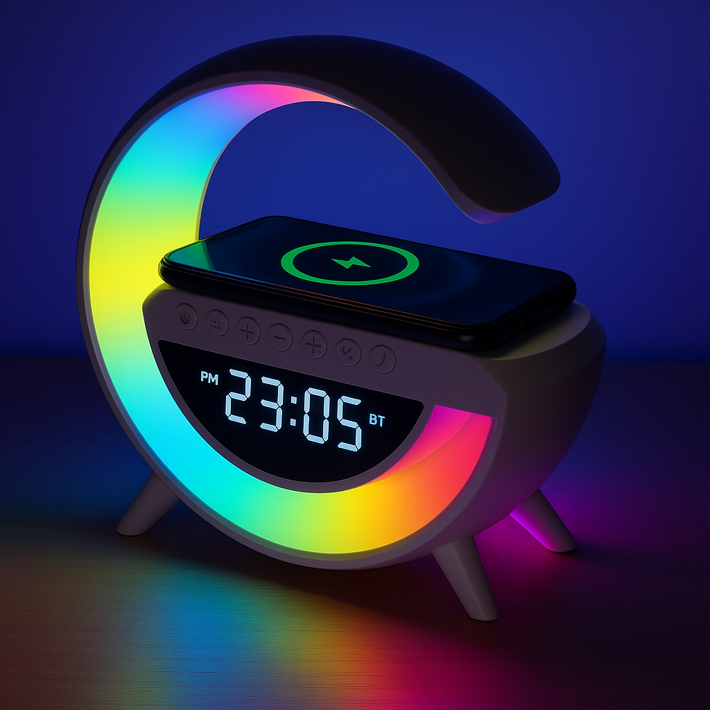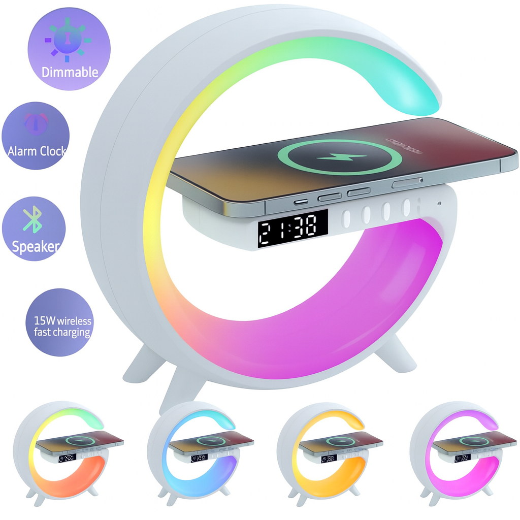 Lampa Smart LED si Incarcator Wireless 15W, Lumini Ambientale, Sincronizare muzicala, Difuzor 5W, Muzica Bluetooth, USB, FM Radio, MicroSD, AUX, Afisaj Ceas Digital, Alarma