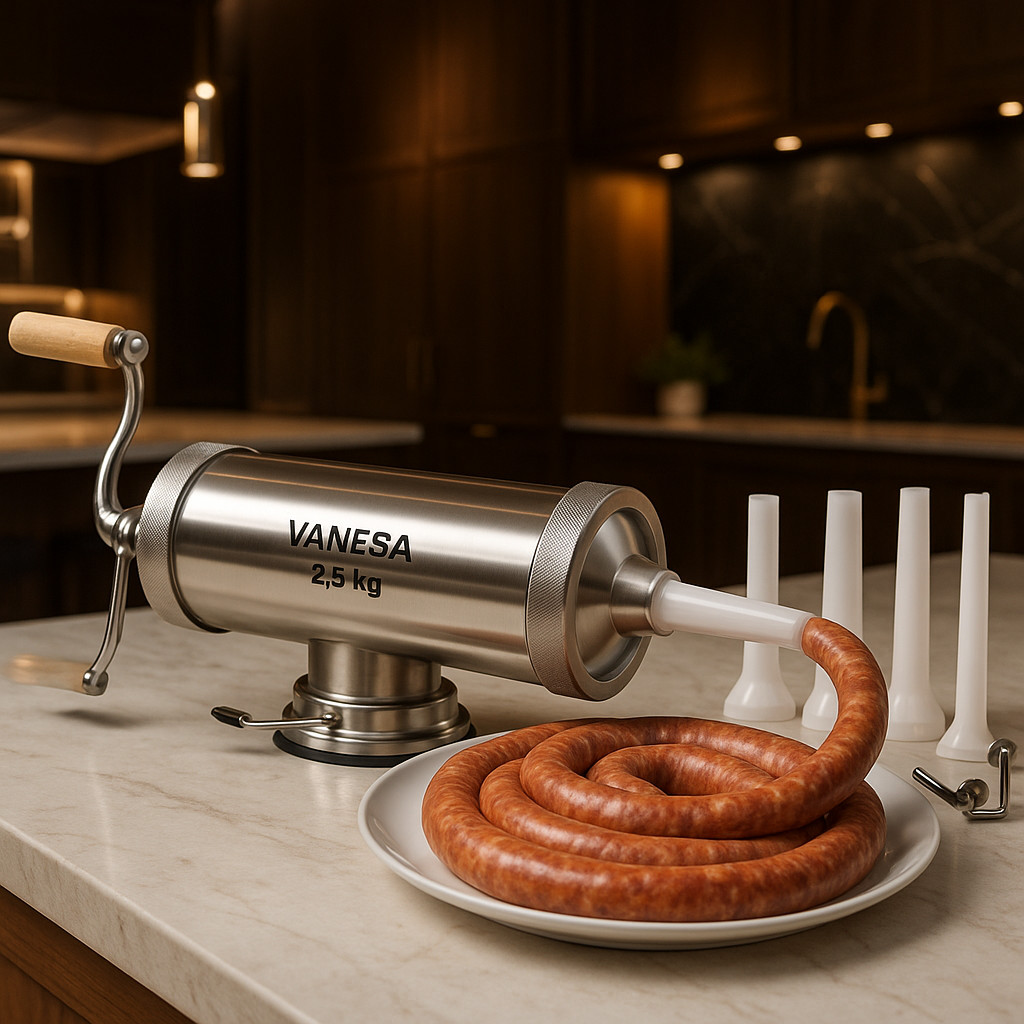 Mașina de cârnați din inox Vanesa, cu o capacitate de 2,5 kg, este alegerea ideală pentru prepararea cârnaților de casă, rapid și ușor. Fabricată din oțel inoxidabil de înaltă calitate, această mașină asigură durabilitate, igienă și întreținere simplă.